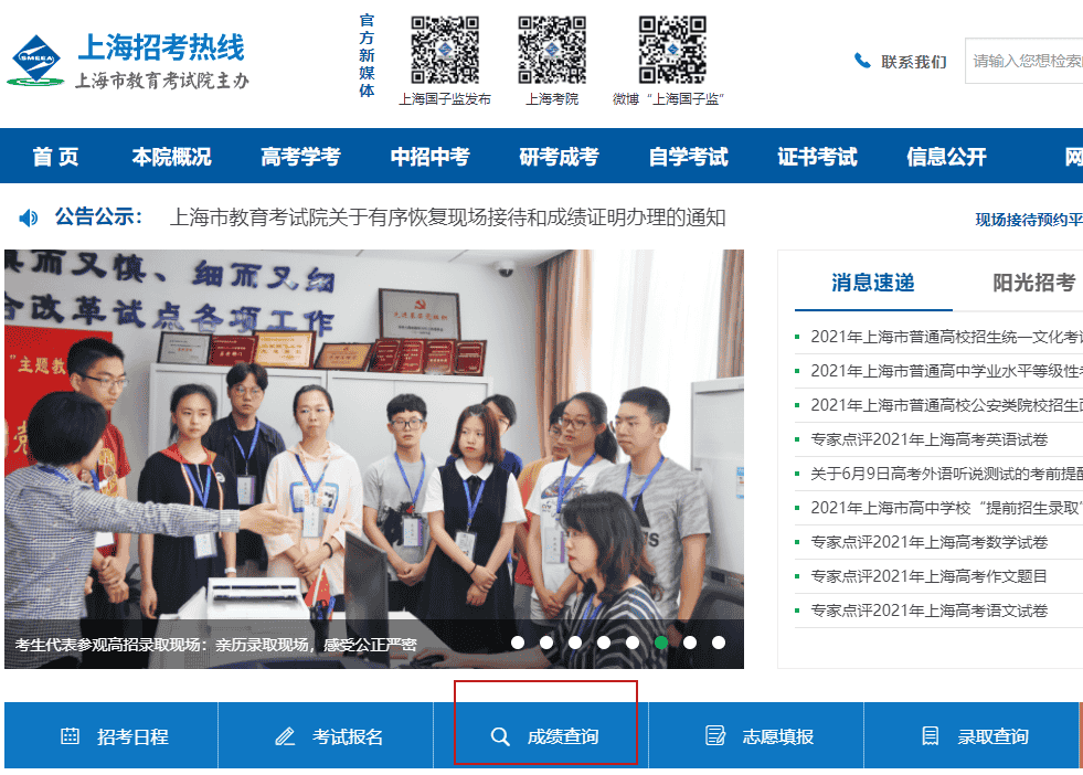 1.已参加2021年本市普通高中学业水平等级性考试的考生,可于6月10日18:00起通过“上海招考热线”网站(www.shmeea.edu.cn)查询成绩。若对本人考试成绩有疑问,可于6月11日10:00至12日16:00通过“上海招考热线”网站申请成绩复核。具体见《2021年上海市普通高中学业水平等级性考试成绩将于6月10日开通查询》。