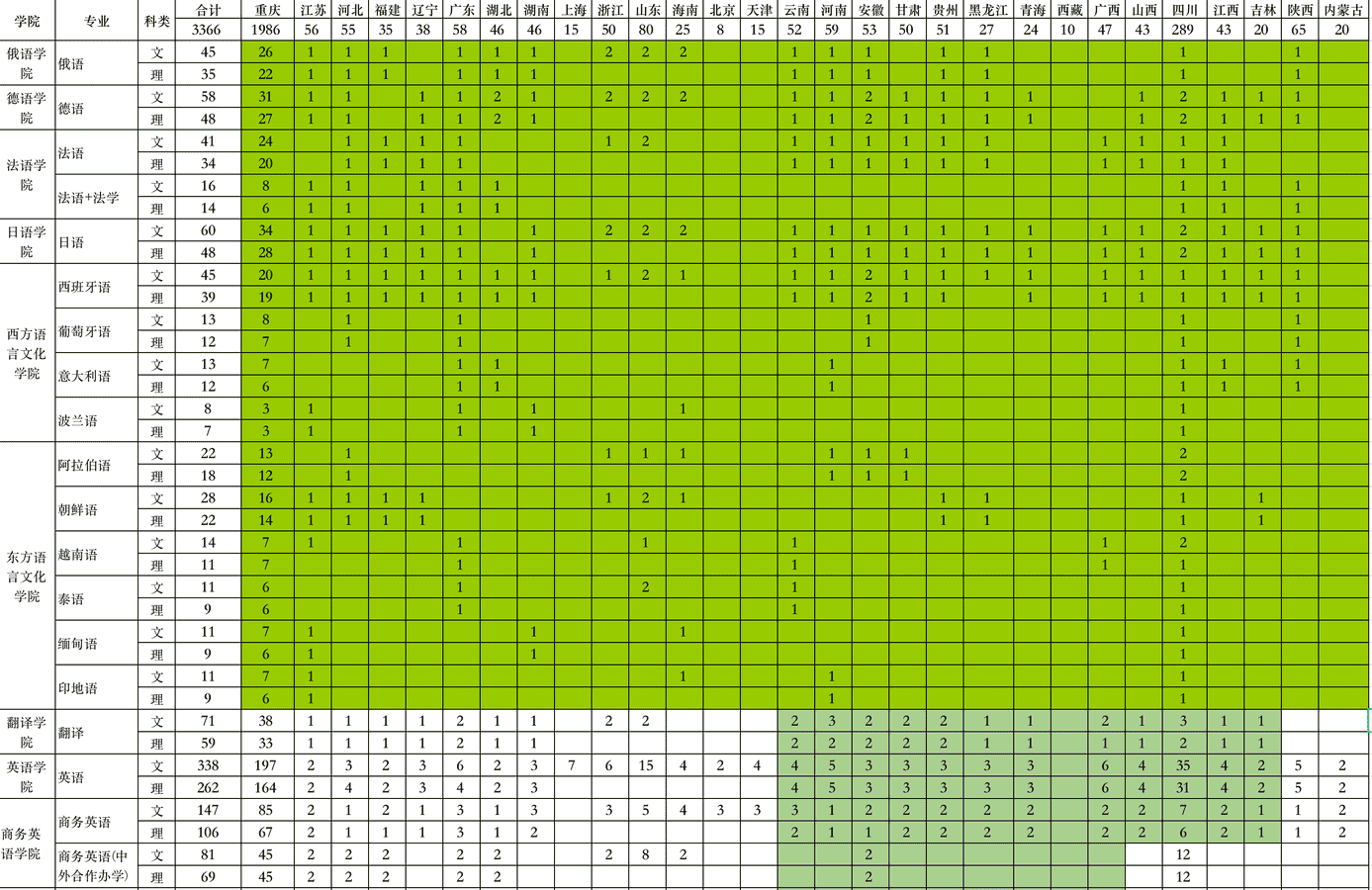 1.俄语、德语、法语、法语+法学、日语、西班牙语、葡萄牙语、意大利语、波兰语、阿拉伯语、朝鲜语、越南语、泰语、缅甸语和印地语专业在本科提前批次录取,在云南纳入本科一批次录取,在青海纳入本科一段录取。