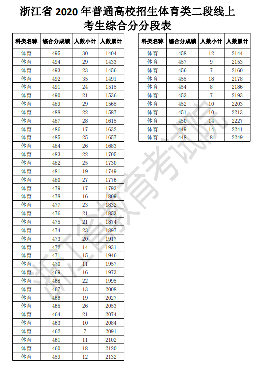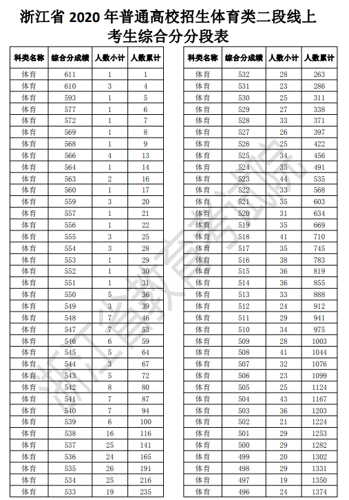 2020浙江高考一分一段表 体育类第二段成绩排名 时间:2020-08-23 09:09 分数线 根据浙江省普通高校招生工作进程,目前,浙江省2020年普通高校招生体育类二段线成绩分数段表已经公布。下面小编为大家详细介绍一下,供大家参考。浙江高考体育类第二段成绩排名