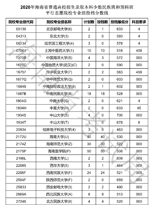 目前,同学们和广大家长朋友们非常关注的2020年海南省普通高校招生录取本科少数民族班和预科班平行志愿院校专业组投档分数线已经公布。下面小编为大家详细介绍一下,供大家参考。