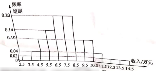 2.为了解某地农村经济情况,对该地农户家庭年收入进行抽样调查,将农户家庭年收入的调查数据整理得到如下频率分布直方图: