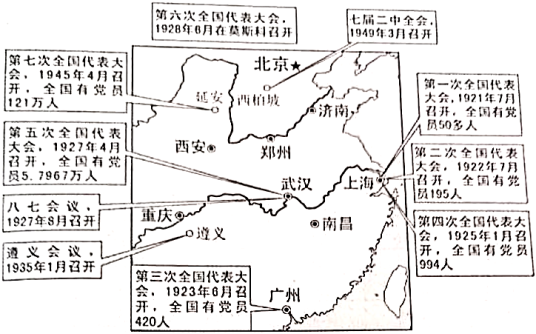图6是中国共产党建立至中华人民共和国成立间部分重要会议示意图。从图中任选两次会议,根据材料并结合所学知识,简析两次会议间中国共产党的发展,并说明其原因。(要求:明确列出两次会议,观点正确,史实准确,论证充分,表述清晰。)