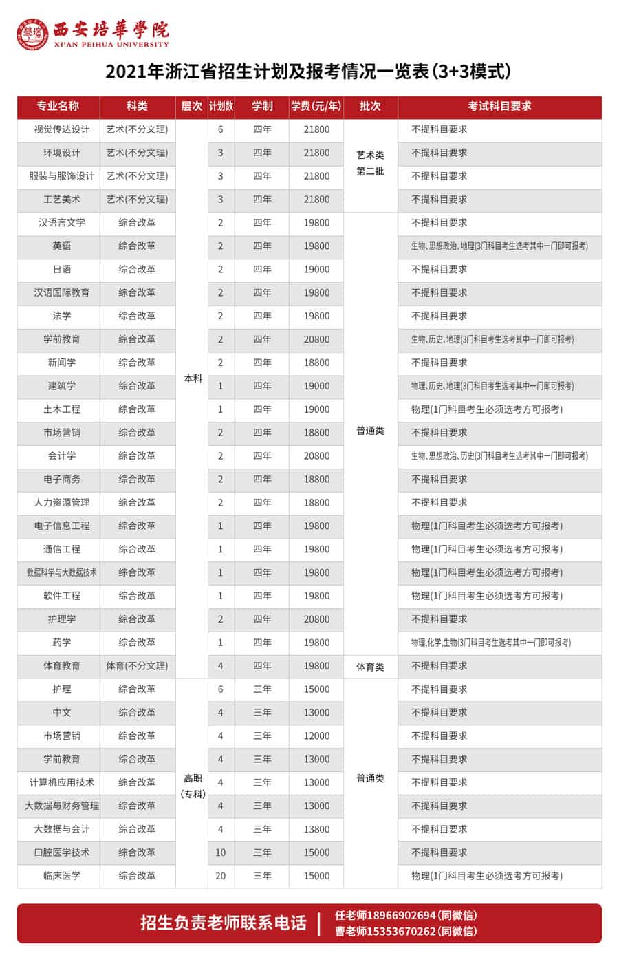 西安培华学院2021年浙江省招生计划及报考情况一览表