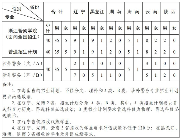 2021年浙江警察学院涉外警务专业面向辽宁省、黑龙江省、湖南省、海南省、云南省、陕西省招生。