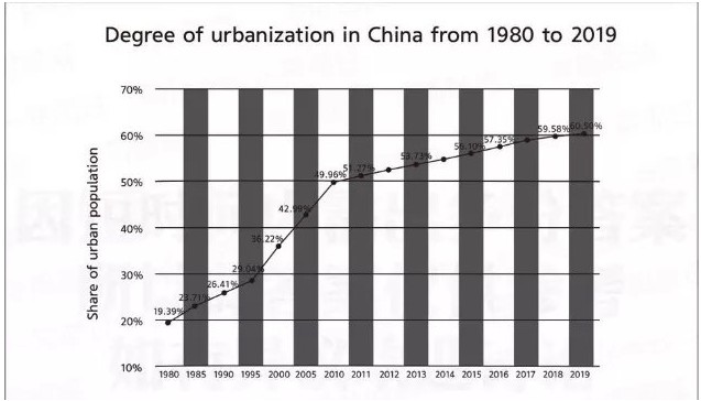 The bar chart supplies us with information concerning the degree of urbanization in China from 1980 to 2019. The data demonstrates that the share of urban population has been increasing year by year from 1980 to 2019. From 1995 to 2010, the share of urban population grew rapidly. In the nine years from 2010 to 2019, the urban population share grew slowly. What accounted for the slow growth of urbanization?