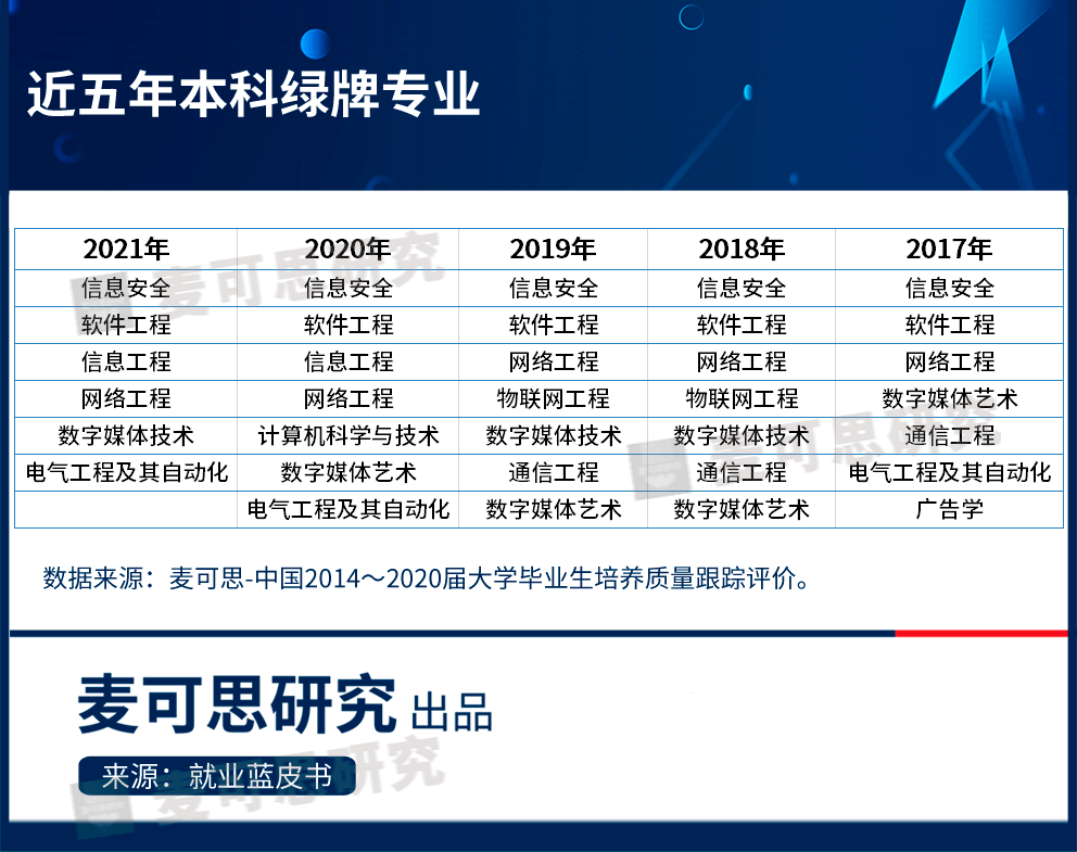 2017—2021年,信息安全、软件工程、网络工程连续5次入选绿牌专业榜单。另外,数字媒体艺术4次入选,数字媒体技术、电气工程及其自动化、通信工程3次入选,信息工程和物联网工程均为2次,计算机科学与技术、广告学各1次。五年来,绿牌榜基本被工学专业霸占。