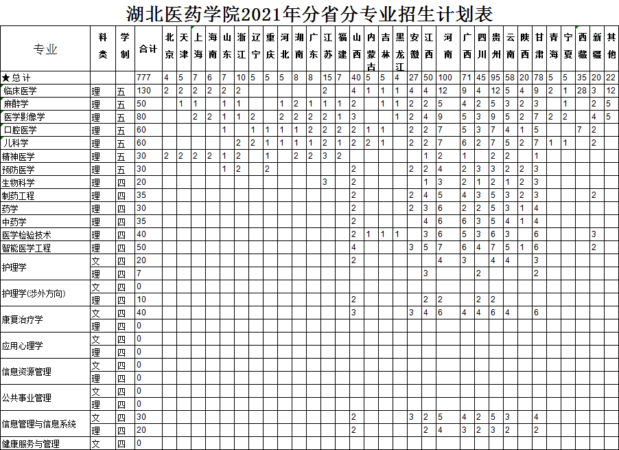2021湖北医药学院各省招生计划及人数
