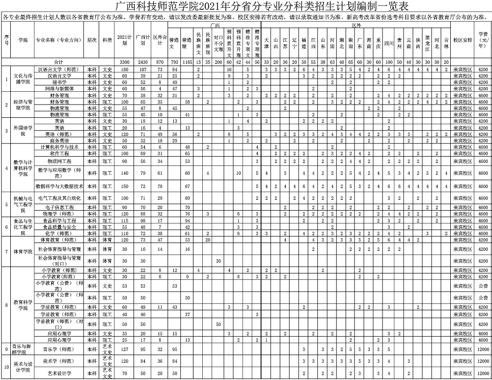 2021广西科技师范学院招生计划 各省招生人数是多少