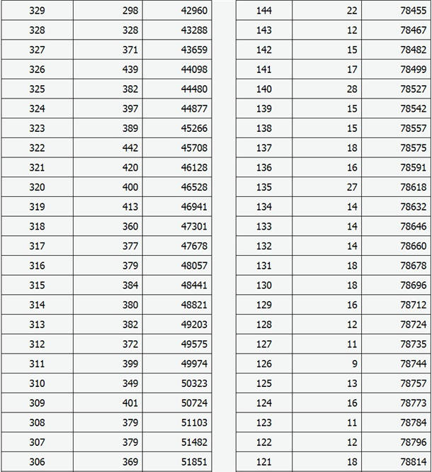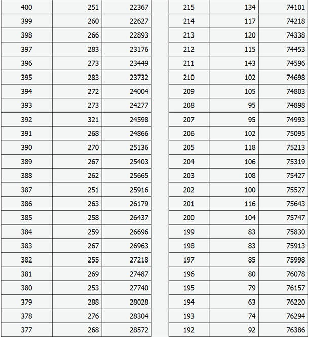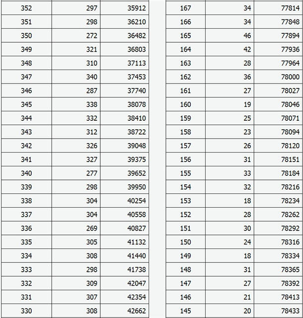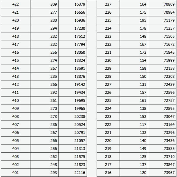 从高到低排序,以一分为一段,制成考生投档分的“一分段表”。一分段表上的分数,不含和志愿相关的志愿加分。“一分段表”上的每个分要对应一个“人数”,即有多少考生是这个分数,还对应了一个“累加人数”,即是这个分数考生的排名。