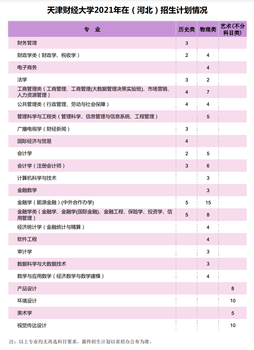 天津财经大学2021年在(河北)招生计划