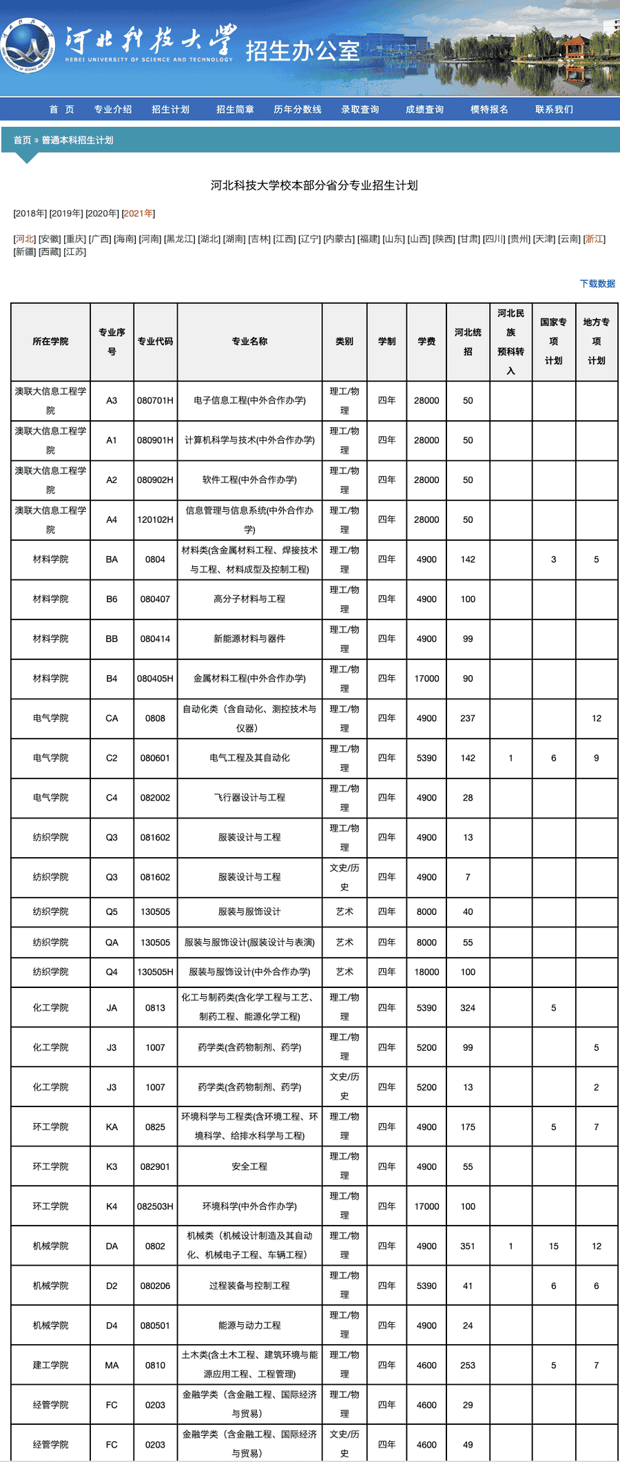 河北科技大学2021年校本部分省分专业招生计划