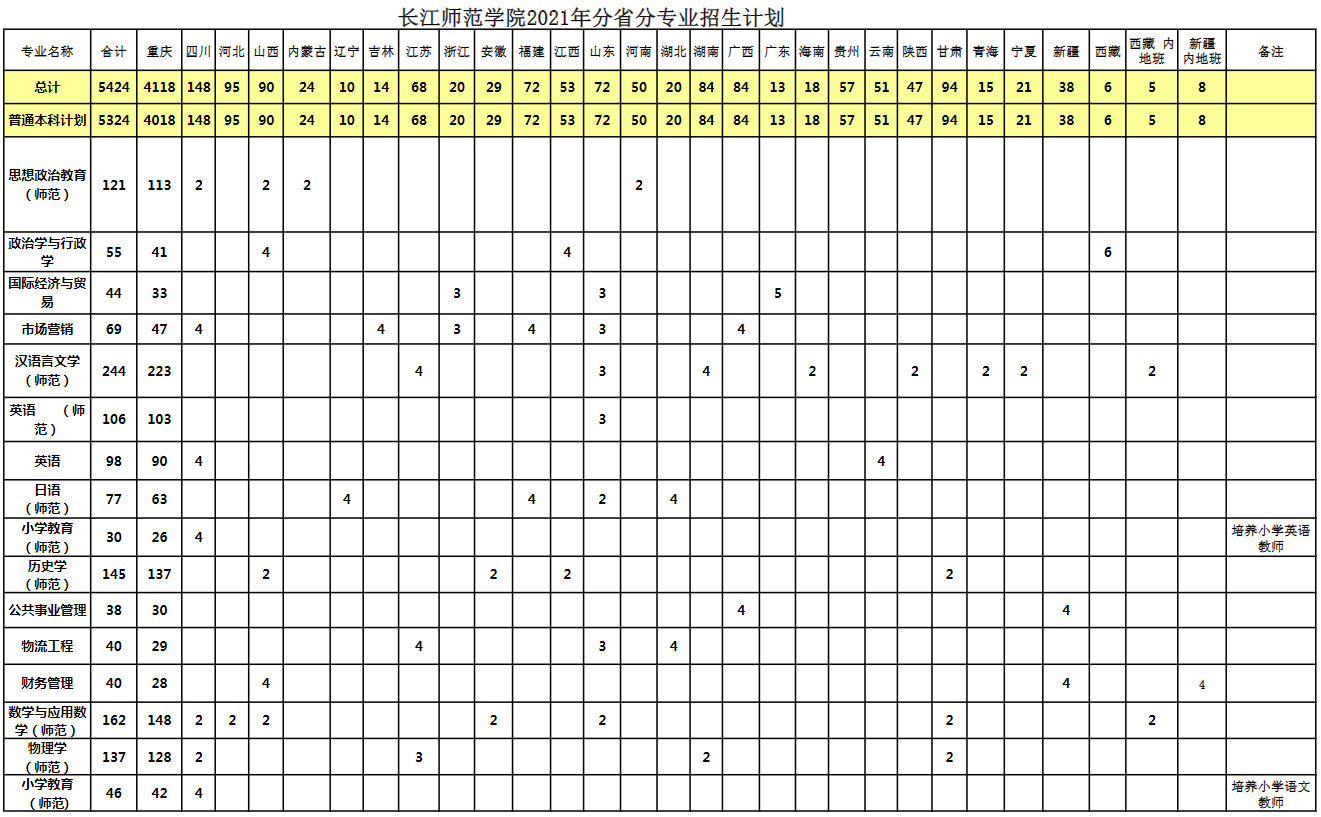 2021年长江师范学院招生计划已经公布,以下是重庆市及全国各专业招生人数,这是填报志愿时非常重要的参考数据,供大家参考,如有变动,以学校官方公布为准: