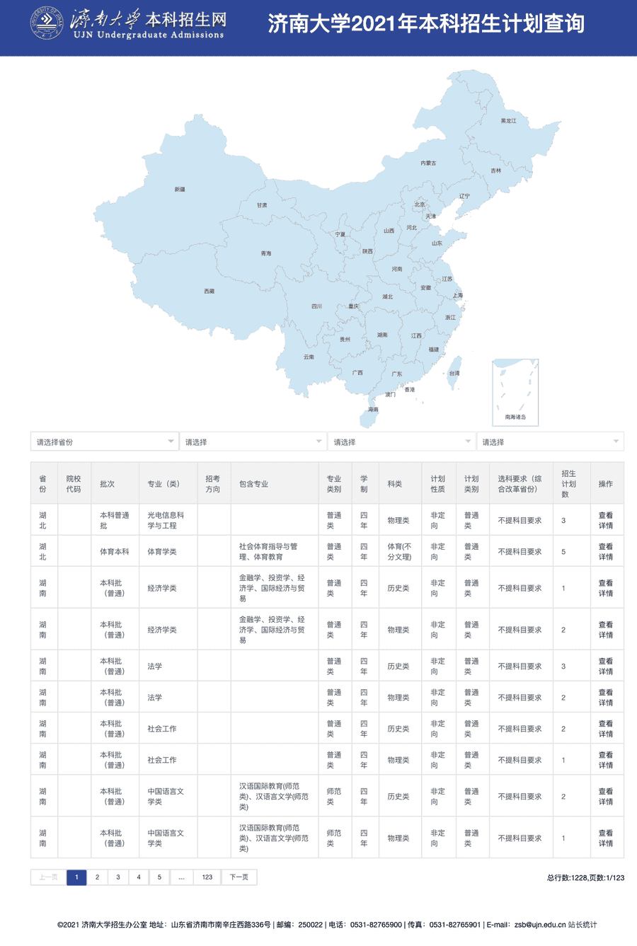 济南大学2021年本科招生计划查询地址:http://map.adm.ujn.edu.cn/2021zsjh/