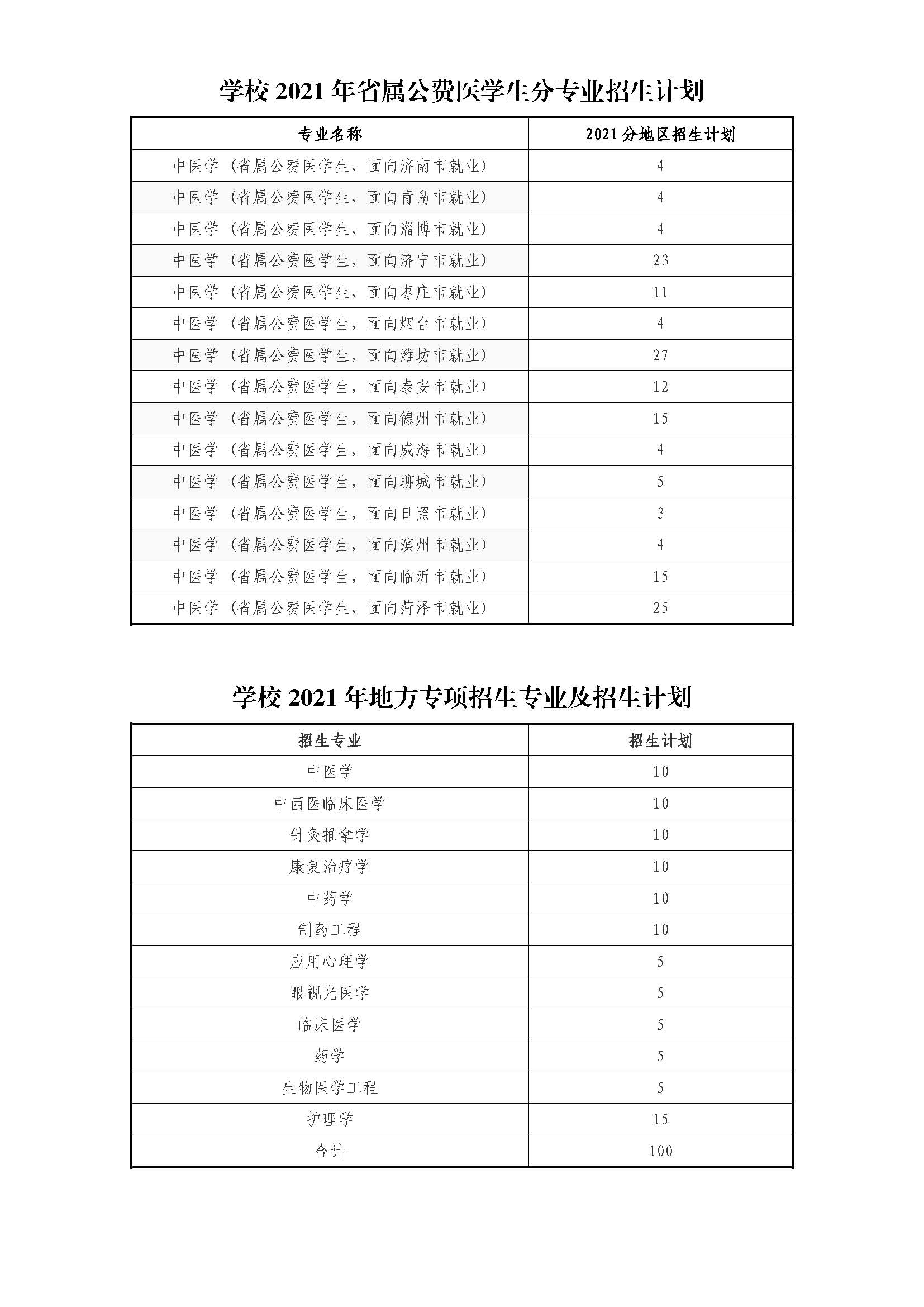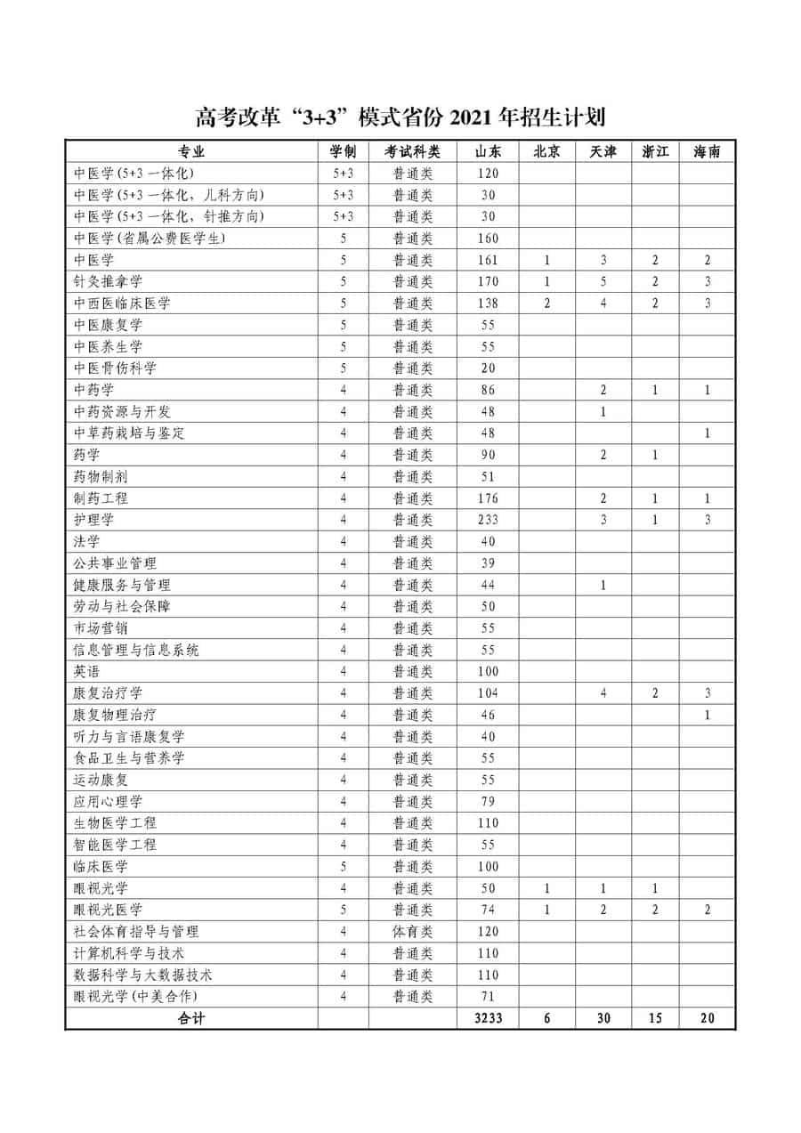 山东中医药大学2021年分省分专业招生计划(高考综合改革“3+3”模式省份)