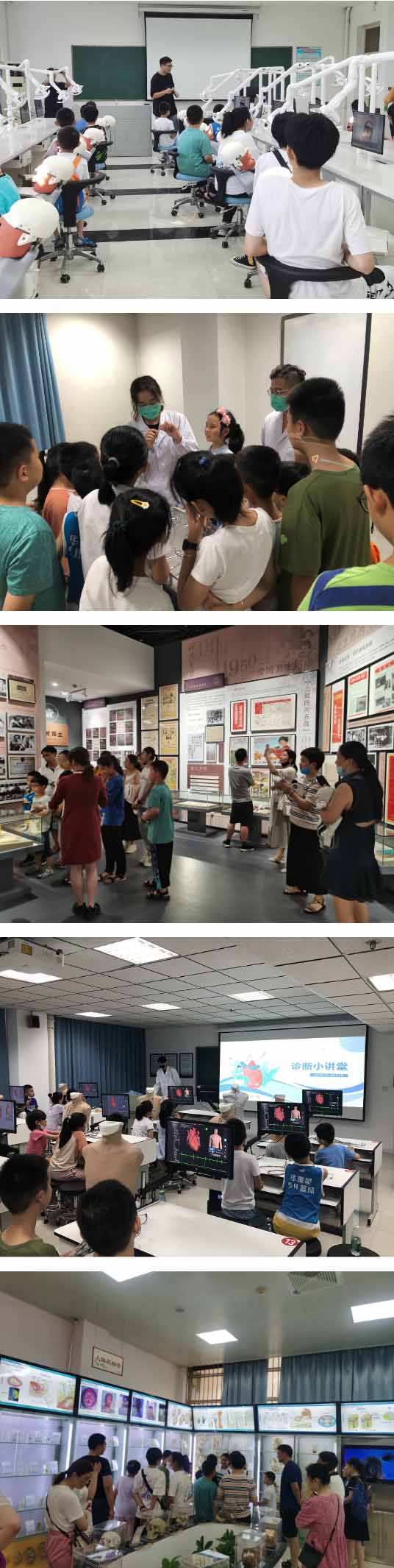 首批体验者先后参观了生命科学馆和赤脚医生博物馆,参与了口腔小医生、临床小医生和医学科学家体验项目。生命科学馆的老师们结合馆内标本、模型、多媒体等资源,向小朋友们科普生命的起源、人体的奥秘,帮助其更好地了解科学、了解医学知识、尊重生命。赤脚医生博物馆的讲解员结合馆内展陈,用生动形象的语言向大家介绍了赤脚医生的发展历史和我国基层卫生事业的发展变迁。口腔医学院实验教学中心老师和志愿者们分工明确,热情接待,让本次来校的中小学生们体验了简单的牙医工作,小小牙医们积极提问,在活跃的氛围中学习了很多口腔保健知识。在临床小医生的体验项目中,小医生们参加诊断小讲堂、观看了视频《外科发展简史》、进行外科基本器械识别、学习心肺复苏术,并在实验室老师和志愿者们的指导下直接操作心脏虚拟听诊系统和心肺复苏模拟人等设备,近距离观察外科常见的手术器械。通过现场解答、互动体验、有奖竞猜等形式,大家充分感受到了临床医学的魅力。
