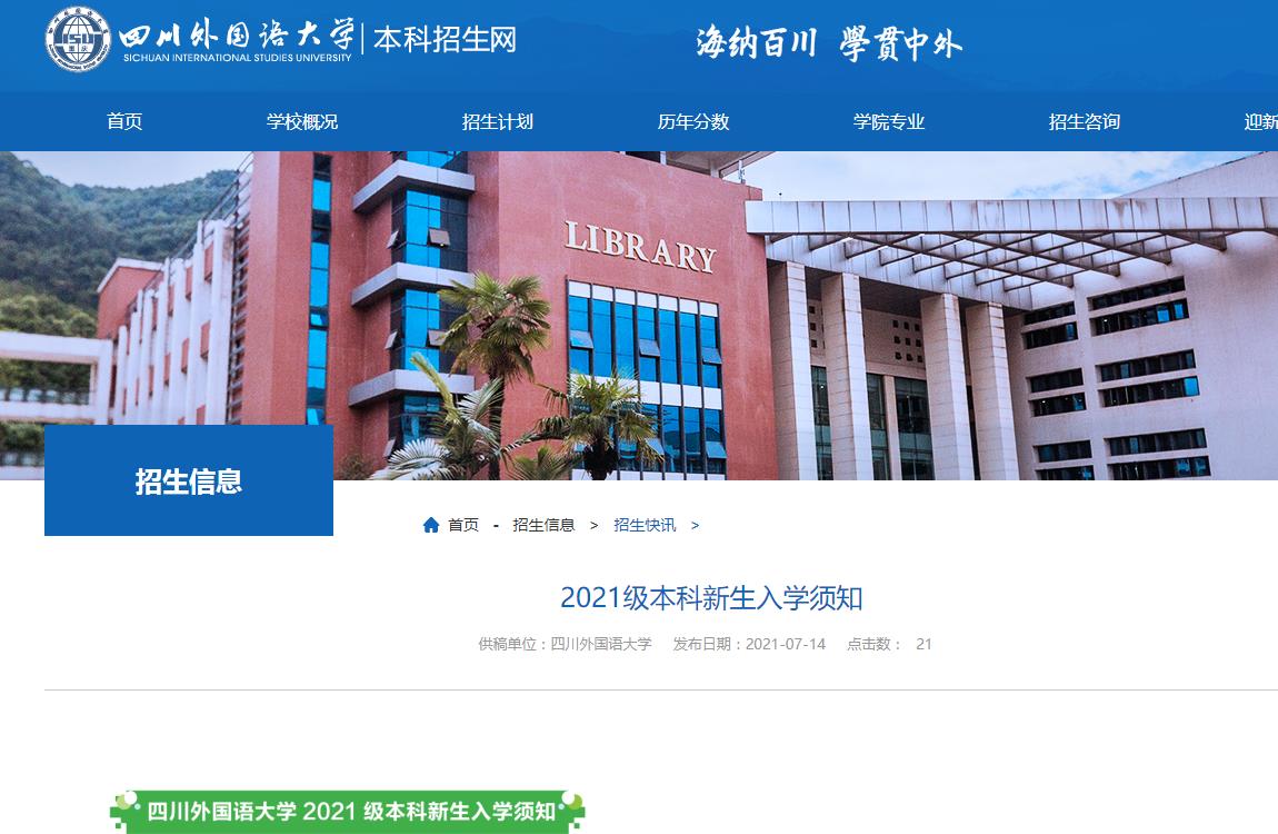 四川外国语大学2021级本科新生入学须知 时间:2021-07-14 12:03 招生计划 文章来源(官网发布地址):http://zs.sisu.edu.cn/f/newsCenter/article/82d80b17e97646c39b12a729682c63bb官网发布缓存图(部分):