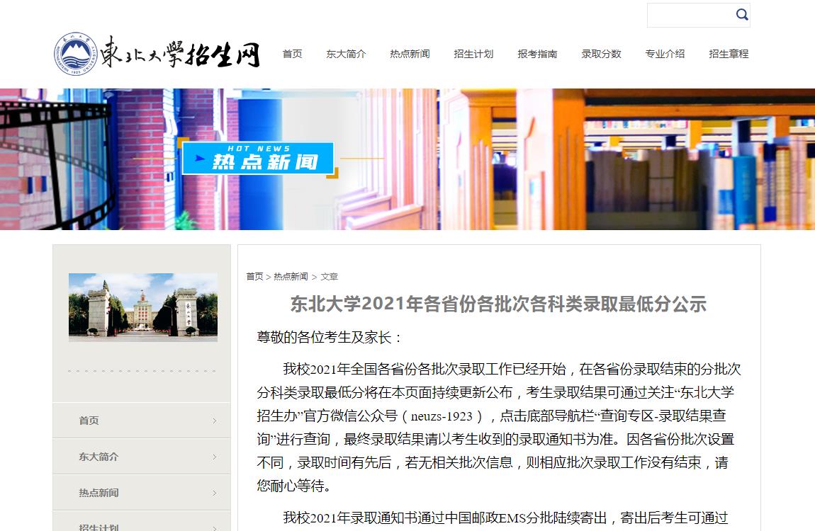 内容:东北大学2021年各省份各批次各科类录取最低分公示【一键点击去官网浏览】