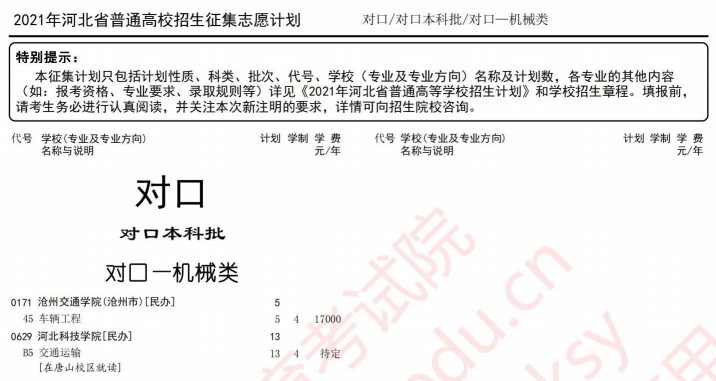 2021河北高考对口本科批征集计划(机械类)