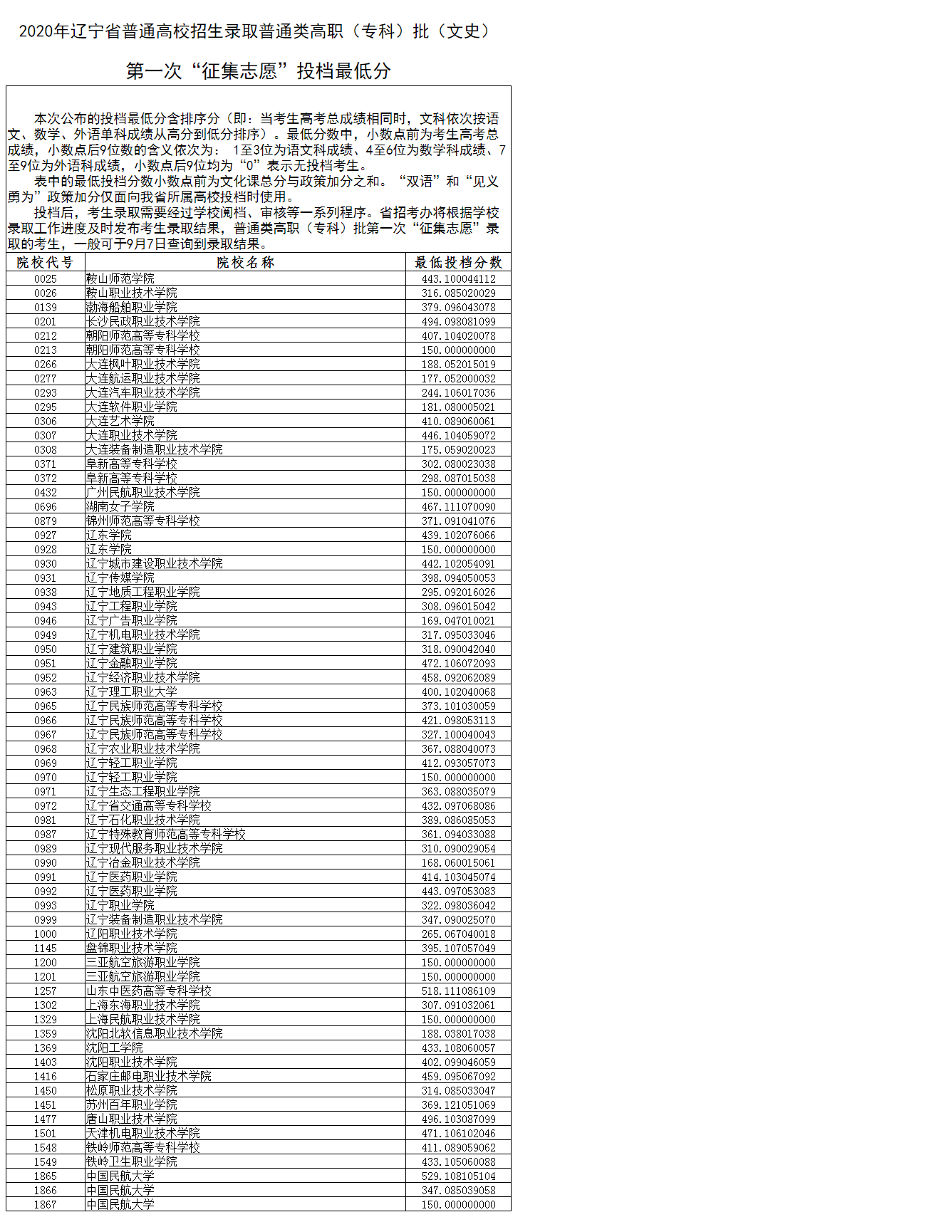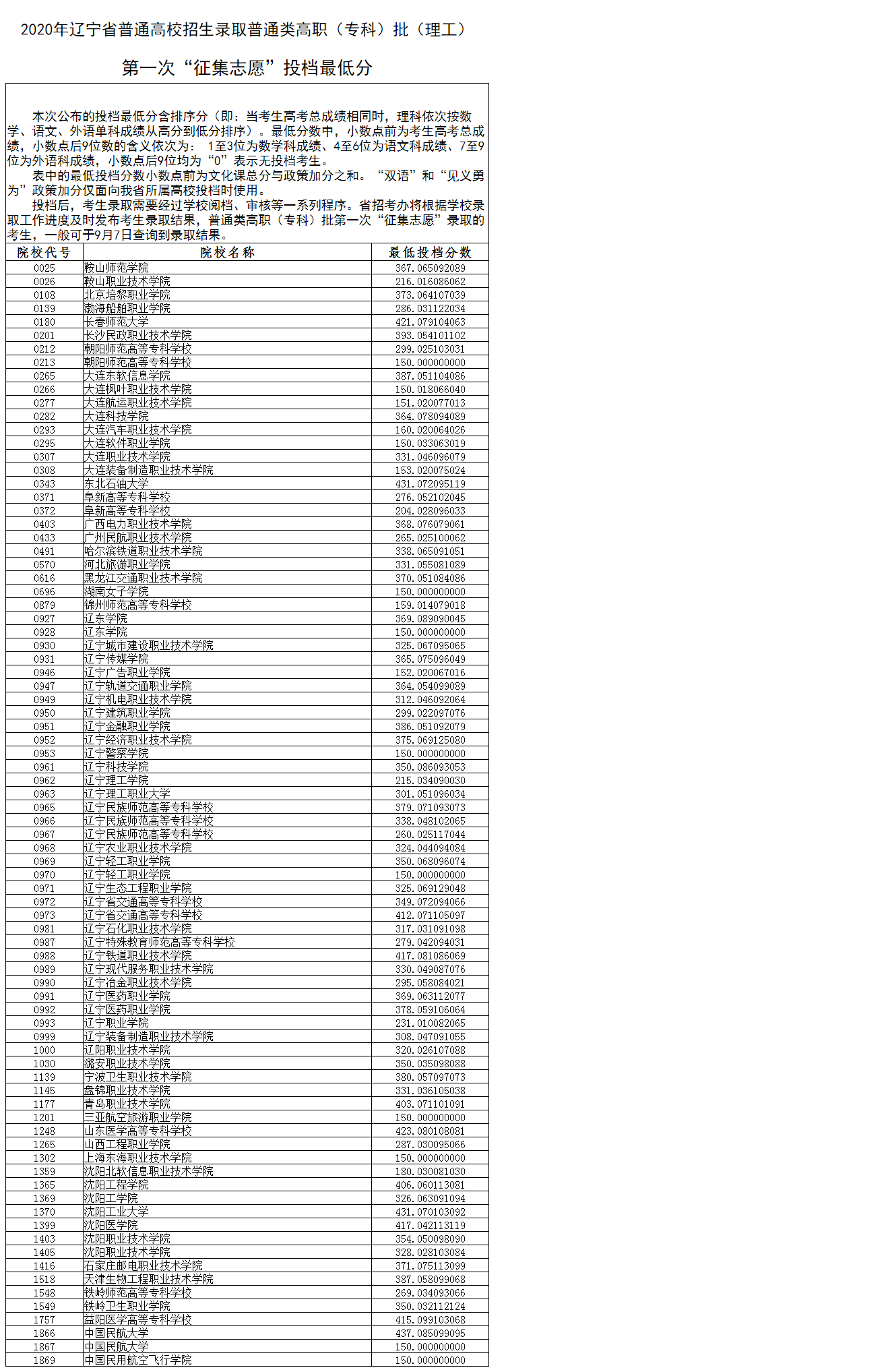 2020年辽宁高考高职专科批第一次征集志愿投档分数线