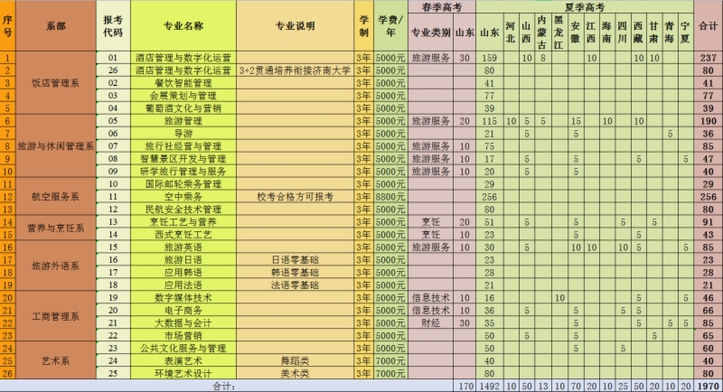 2021年山东旅游职业学院招生计划已经公布,以下是山东省及全国各专业招生人数,这是填报志愿时非常重要的参考数据,供大家参考,如有变动,以学校官方公布为准:
