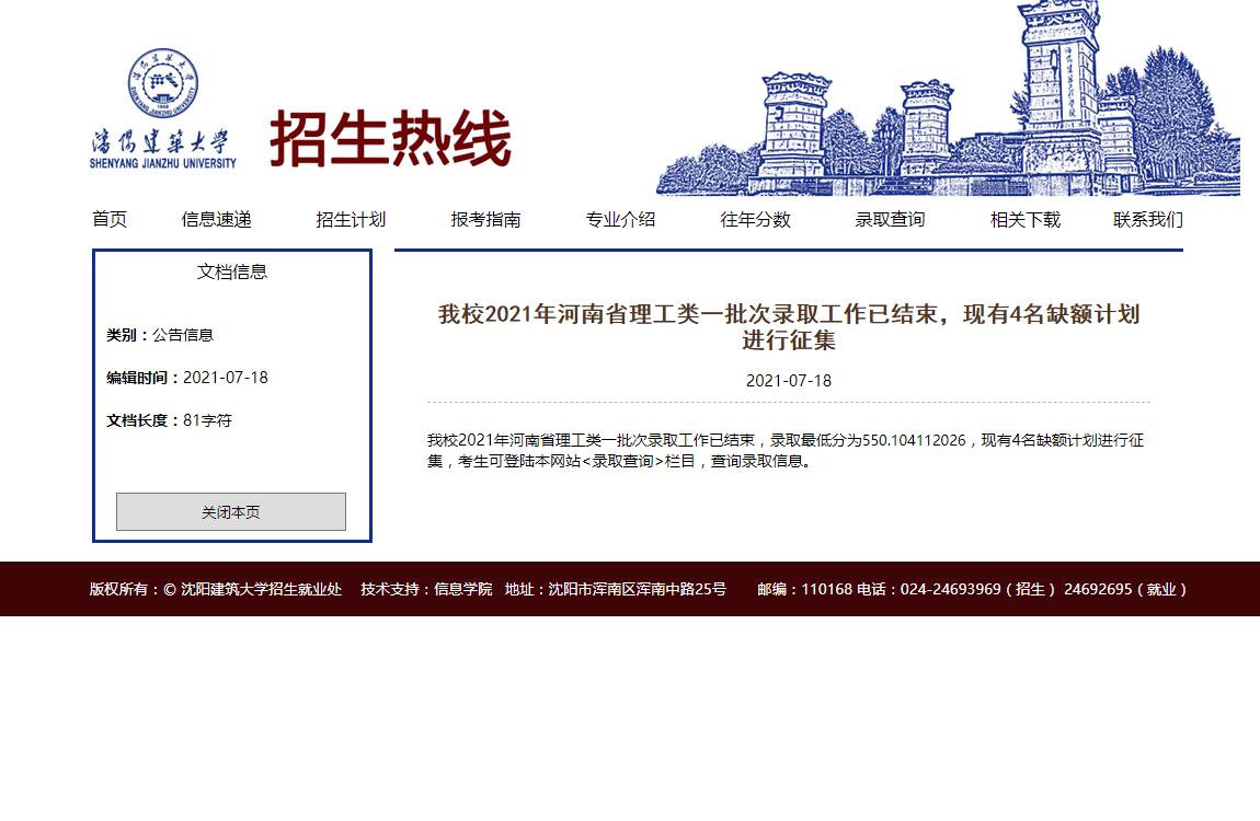 沈阳建筑大学2021年河南省理工类一批次征集计划