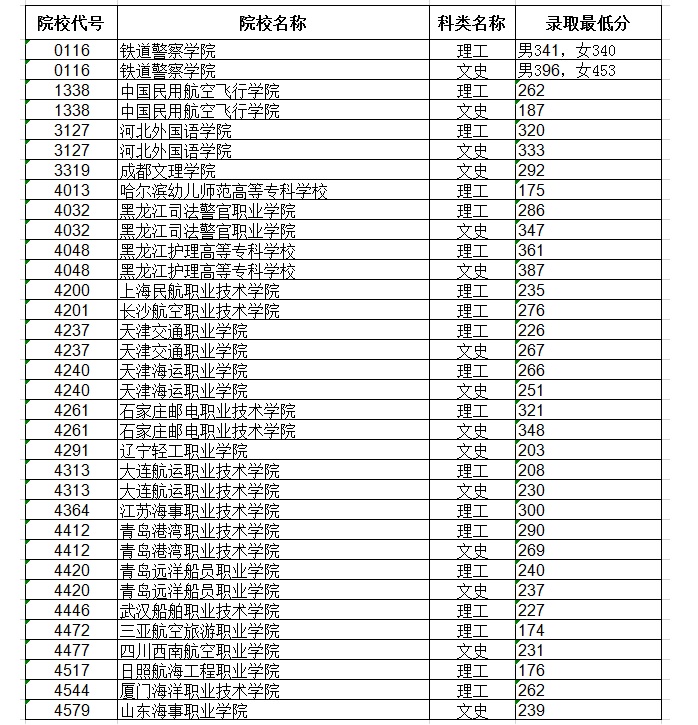 2020年黑龙江高职专科提前批录取最低分