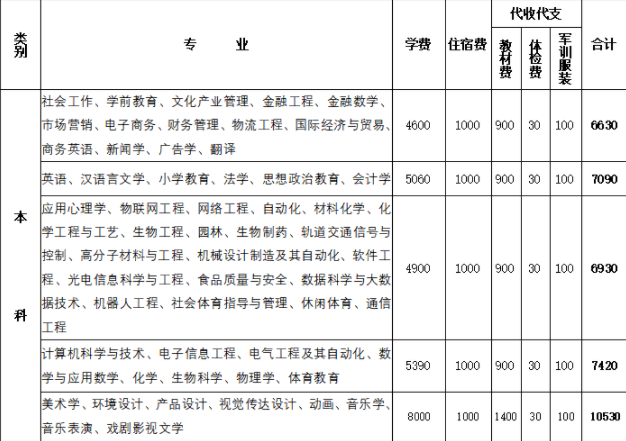 淮南师范学院学费标准:普通类专业4600-5390元/年,艺术类专业8000元/年,各专业学费收费标准如下图所示: