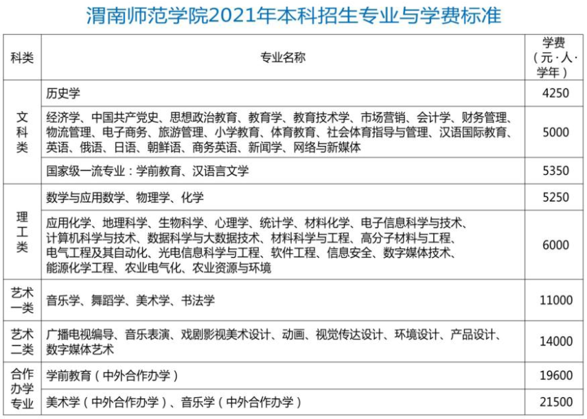 2021渭南师范学院学费 各专业每年多少钱