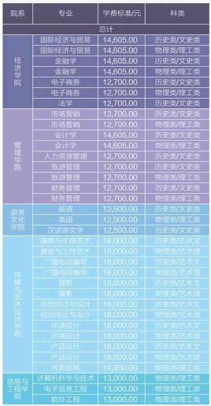 普通类专业学费为12500-14605元/年;艺术类专业学费为18000元/年。
