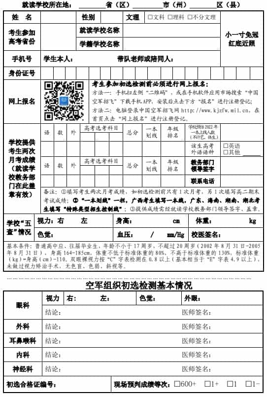 符合招飞基本条件的学生,手机下载“空军招飞APP”或登录空军招飞网(http://www.kjzfw.mil.cn)进行网上报名,填写《2022年度空军招收高中生飞行学员初选参检表》(可在空军招飞网下载打印或复印),参检表经学校盖章后学生自行保管。学校审查汇总后,将报名名册上报当地招生办,由地市教育招生部门汇总后反馈给广州选拔中心,列入招飞候选对象。
