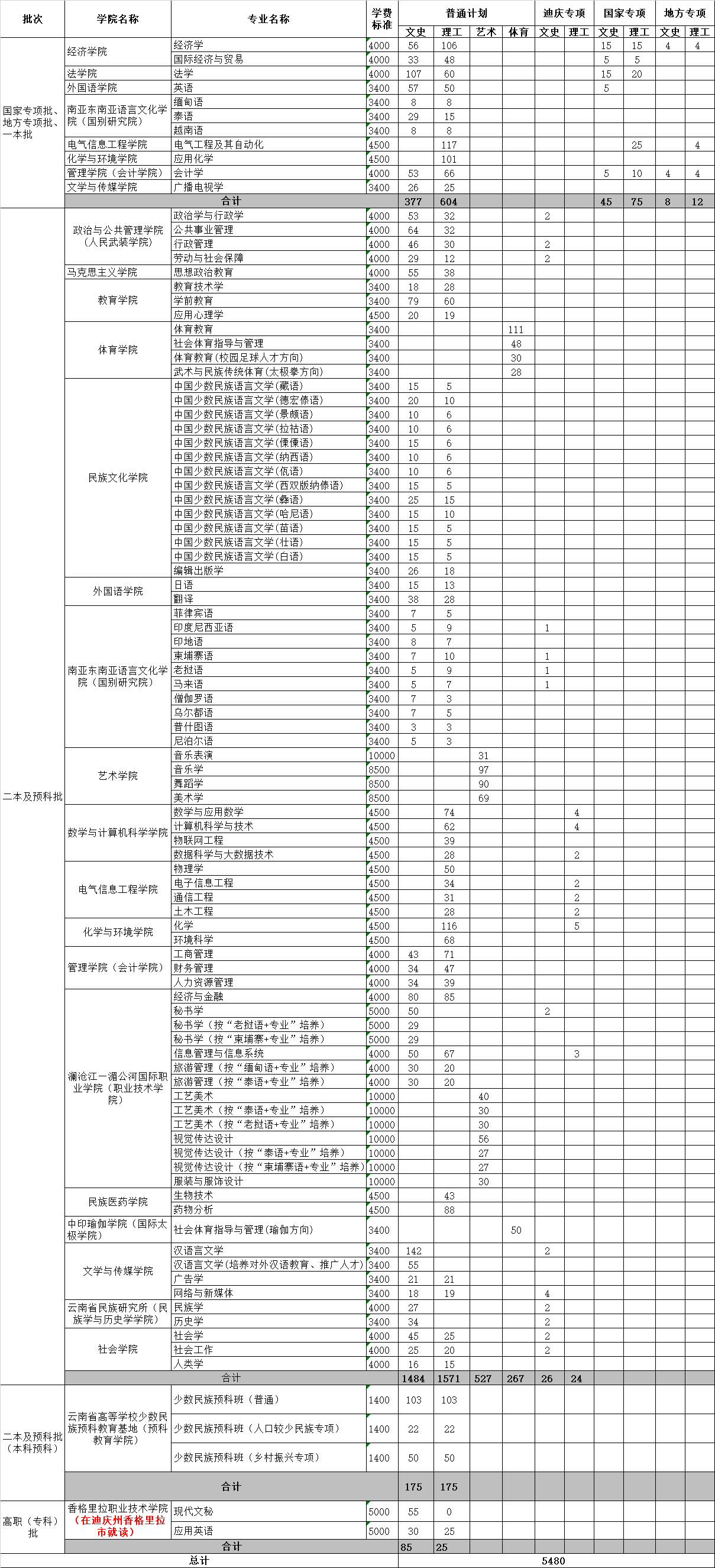 省级重点专业(12门):中国少数民族语言文学、计算机应用技术、民族学、泰语、社会学、电子信息工程、法学、文化事业管理、缅甸语、越南语、老挝语、柬埔寨语