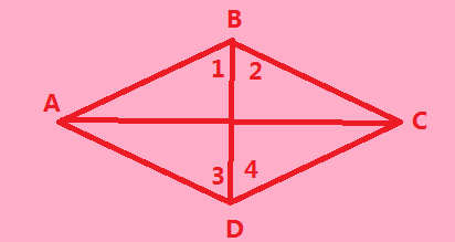 在菱形ABCD中,BD为对角线,求证:∠1=∠2、∠3=∠4。