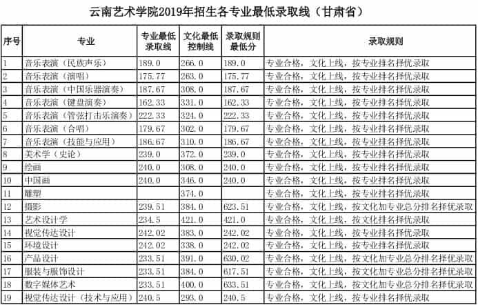 云南艺术学院2019年甘肃省艺术类专业录取分数线