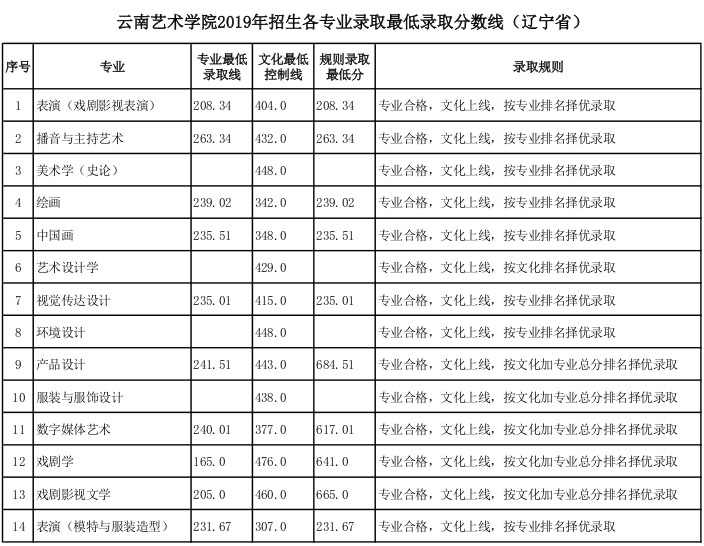 云南艺术学院2019年辽宁省艺术类专业录取分数线