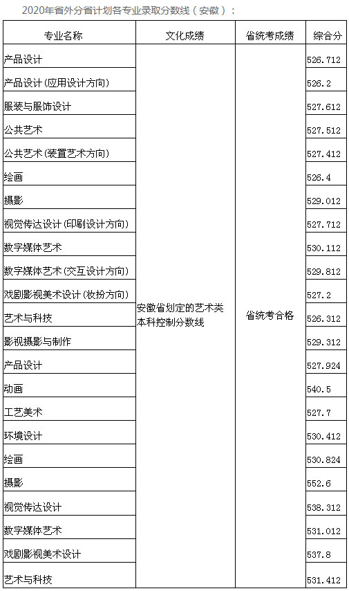 山东省外艺术类本科专业录取规则 设计美术类专业: 1、安徽省、湖南省、河北省、甘肃省、宁夏回族自治区、新疆维吾尔自治区:对于达到生源所在省份美术类专业统考本科合格线且高考文化成绩达到生源所在省份艺术类专业本科文化录取控制分数线的考生,按照综合分(综合分=美术类统考成绩×750÷省美术统考满分×60%+文化成绩×40%)以“成绩优先,遵循志愿”的原则依次排序,确定录取专业,各专业志愿间不设分数级差。专业志愿无法满足时,服从调剂的考生,可调剂至未完成计划的专业;不服从调剂的,作退档处理。如综合分出现并列情况,取生源所在省份美术类专业统考成绩高者;如美术类统考成绩也相同,取外语成绩高的;如外语成绩也相同,取语文成绩高的。 2、江苏省:对于达到江苏省美术类专业统考合格线的考生,录取批次、投档比例等以江苏省省级招生主管部门安排为准。对进档考生按投档成绩以“成绩优先,遵循志愿”的原则,从高分到低分依次排序择优录取,确定录取专业,各专业志愿间不设分数级差。专业志愿无法满足时,服从调剂的考生,可调剂至未完成计划的专业;不服从调剂的,作退档处理。如投档成绩出现并列情况,取省美术类专业统考成绩高的;如统考成绩相同,取外语成绩高的;如外语成绩也相同,取语文成绩高的。 3、其他省份:按校考考试类别划定专业合格线。对于校考专业成绩合格且文化课成绩达到生源所在省份划定的艺术类专业本科文化录取控制分数线的一志愿考生,按校考专业成绩以“成绩优先,遵循志愿”的原则,从高分到低分依次排序择优录取,确定录取专业,各专业志愿间不设分数级差。专业志愿无法满足时,服从调剂的考生,可调剂至未完成计划的专业;不服从调剂的,作退档处理。如校考专业成绩并列,取文化成绩高的;如文化成绩相同,取外语成绩高的;如外语成绩也相同,取语文成绩高的。【本类别专业全部实行文理兼招,按类别总计划统一排序。】 史论类专业:按校考考试类别划定专业合格线。对于校考专业成绩合格、文化课成绩达到生源所在省份划定的艺术类专业本科文化录取控制分数线,且外语成绩达到我校要求的一志愿考生,按文化成绩以“成绩优先,遵循志愿”的原则,从高分到低分依次排序择优录取,确定录取专业,各专业志愿间不设分数级差。专业志愿无法满足时,服从调剂的考生,可调剂至未完成计划的专业;不服从调剂的,作退档处理。如文化成绩并列,取校考成绩高的;如校考成绩相同,取外语成绩高的;如外语成绩也相同,取语文成绩高的。【本类别专业全部实行文理兼招,按类别总计划统一排序。】 书法学专业:对于校考专业成绩合格,且文化课成绩达到生源所在省份划定的艺术类专业本科文化录取控制分数线的一志愿考生(如生源所在省份分艺术类别划定本科文化录取控制分数线,则执行本专业所属艺术类别的本科文化录取控制分数线),按校考专业成绩以“成绩优先,遵循志愿”的原则,从高分到低分依次排序择优录取,确定录取专业。如校考专业成绩并列,取文化成绩高的;如文化成绩相同,取语文成绩高的;如语文成绩也相同,取外语成绩高的。【本专业实行文理兼招,按计划统一排序】 录取说明:需要按文化成绩排序时,若文化课高考满分不是750分的,按比例折算后再进行排序。