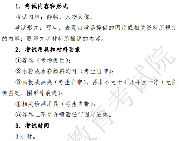广东省2021年普通高等学校招生统一考试美术术科考试说明发布,考试采用全自动终点摄像计时装置计取成绩。若全自动终点摄像计时装置出现故障,无法计取成绩时,则重新安排该组考试。成绩以对应的得分计取,若成绩在评分标准的两个相邻分值之间,则计取其中较低的分值。