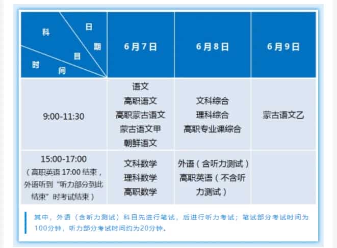 普通高校招生全国统一考试(含高等职业院校对口招收中等职业学校毕业生单独考试)于2022年6月7日开始举行,各科目考试时间安排如下: