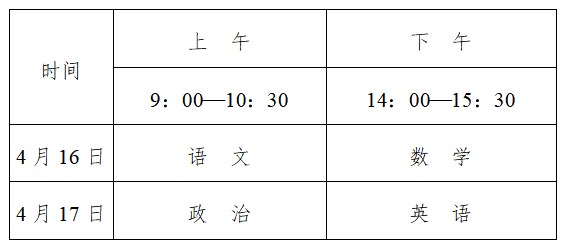 文化考试科目为语文、数学、政治、英语四科,每科满分为150分,4科满分为600分,使用国家通用语言文字作答。考试时间为2022年4月16日至17日。我省考点设在西华师范大学(地址:四川省南充市顺庆区师大路1号西华师范大学华凤校区一期朝阳楼)。具体时间安排如下: