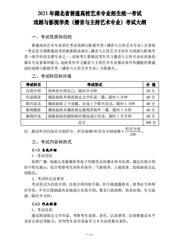 2021年湖北播音主持类统考考试大纲公布 时间:2020-10-10 10:38 艺术特长生 进入十月,艺术类考生即将进入紧张的备考阶段。近日,湖北省教育考试院发布了2021年播音主持与艺术类统考考试的大纲,下面小编为大家详细盘点一下相关信息,供大家参考。湖北2021年播音主持类考试大纲