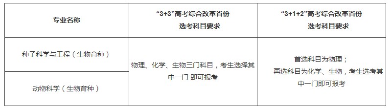 我校2022年实施生物育种强基计划招生。招生专业为种子科学与工程(生物育种)、动物科学(生物育种)。非高考综合改革省份招收理工类考生,高考综合改革省份选考科目要求见下表:
