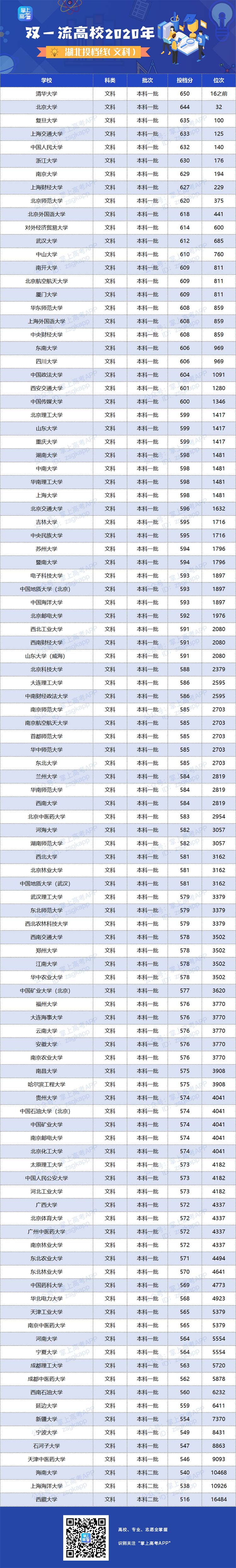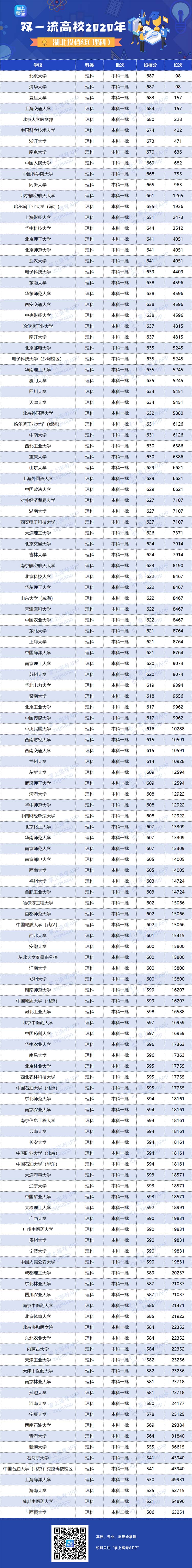 湖北省2020年全国“双一流”大学投档分数线一览