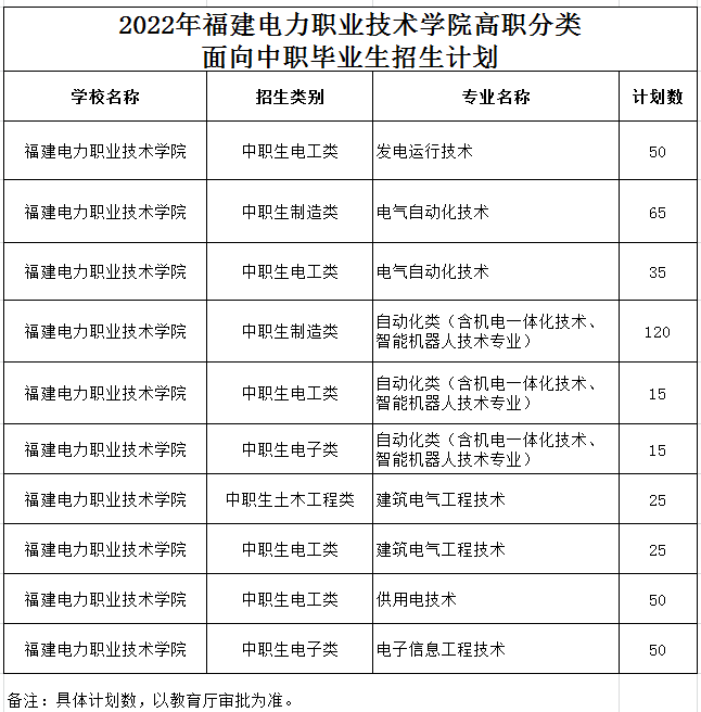2022福建电力职业技术学院高职分类考试招生专业及计划