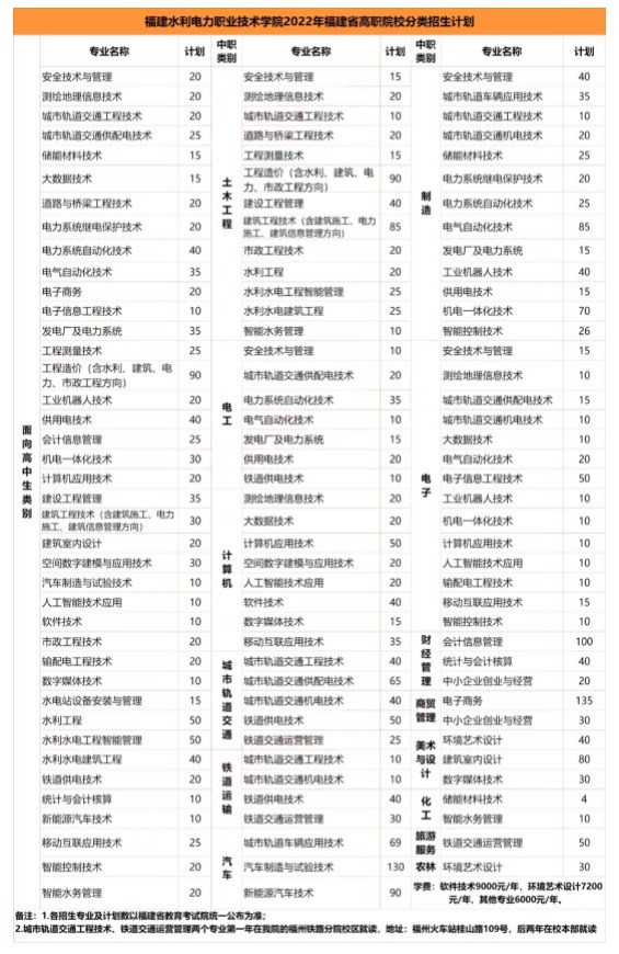 福建水利电力职业技术学院高职分类考试招生专业及计划2022