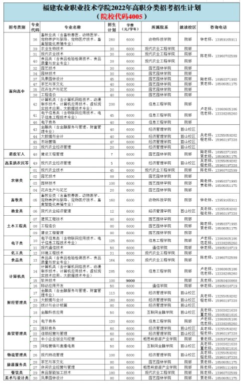 2022福建农业职业技术学院高职分类考试招生专业及计划