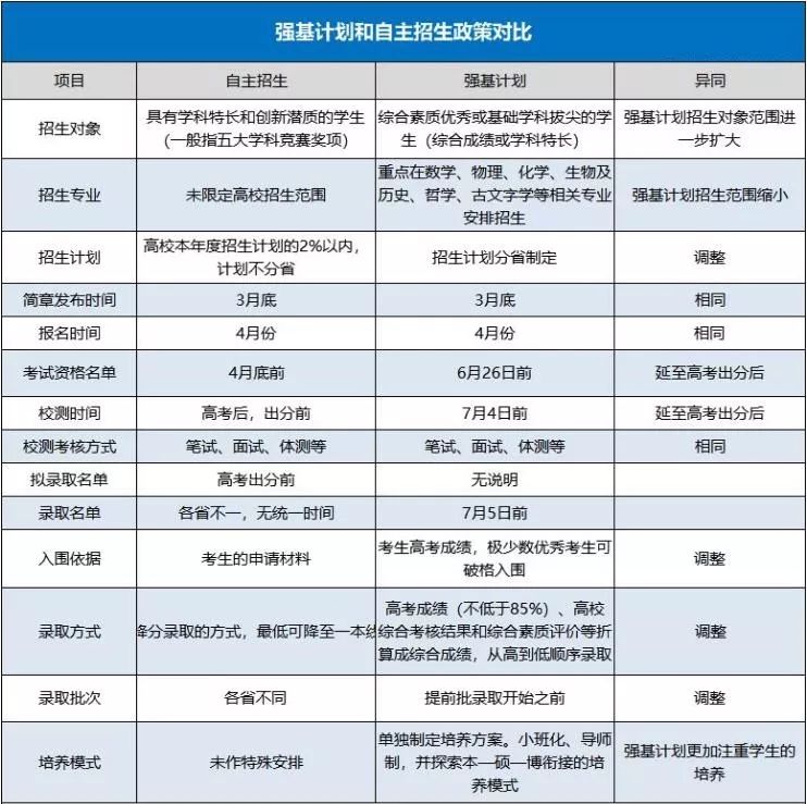 强基计划和自主招生的区别:招生定位不同,强基计划主要是招有综合素质优秀或基础学科拔尖的学生,而自主招生是招具有学科特长和创新潜质的学生。招生专业范围不同,强基计划有重点相关专业范围,而自主招生未限定高校招生专业范围。