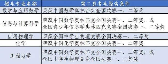 荣获全国青少年学科奥林匹克竞赛(数学、物理、化学、信息学)全国决赛一、二等奖。全国青少年学科奥林匹克竞赛获奖学生以全国青少年科技竞赛获奖名单公示网站公示的名单为准。各招生专业对应的报名条件如下表所示。