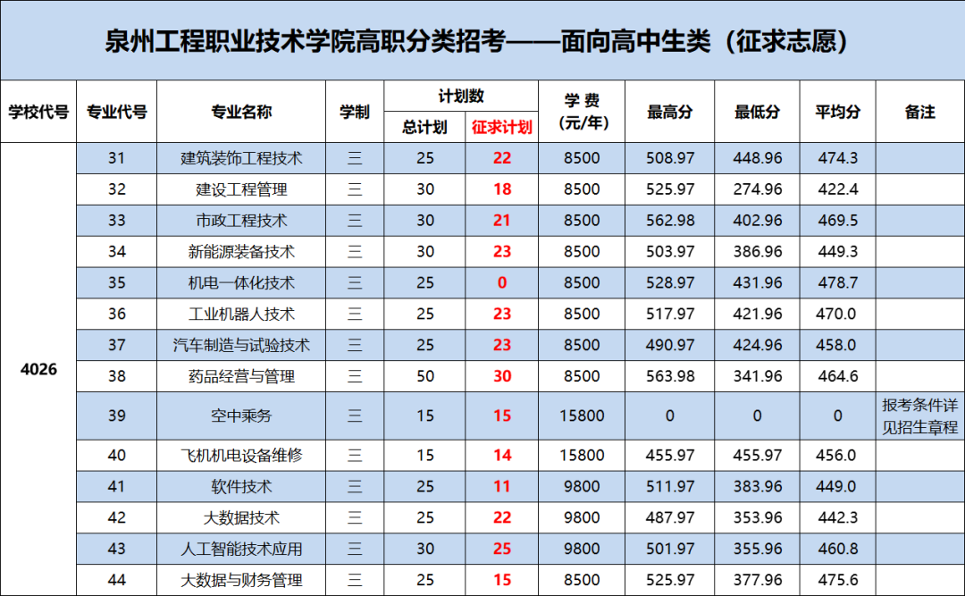 2022泉州工程职业技术学院录取投档分数线及征求计划