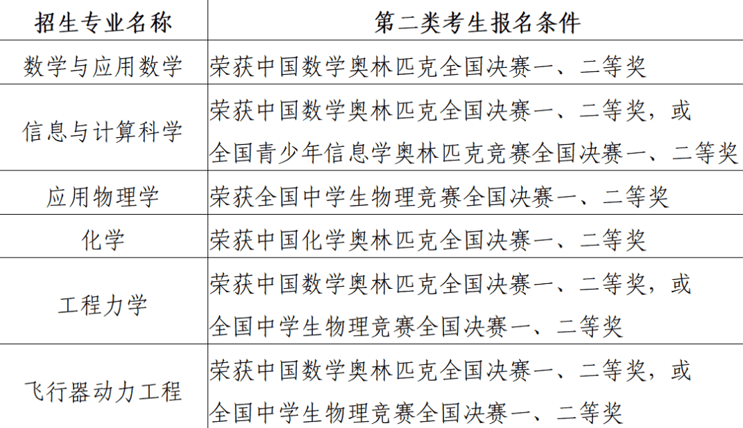 荣获全国青少年学科奥林匹克竞赛(数学、物理、化学、信息学)全国决赛一、二等奖。全国青少年学科奥林匹克竞赛获奖学生以全国青少年科技竞赛获奖名单公示网站(http://gs.cyscc.org/)公示的名单为准。各招生专业对应的报名条件如下表所示。