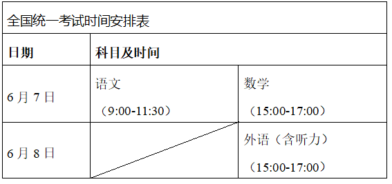 (1)全国统一考试。全国统一考试科目考试时间安排在6月7日全天和6月8日下午,其中语文考试时长为150分钟,数学、外语考试时长均为120分钟。