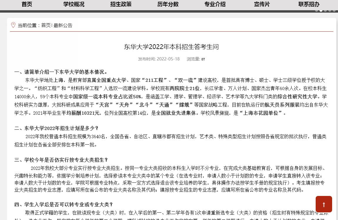 东华大学地处上海,是教育部直属全国重点大学、国家“211工程”、“双一流”建设高校,是首批具有博士、硕士、学士三级学位授予权的大学之一。“纺织工程”和“材料科学工程”入选双一流建设学科。学校现有两院院士21位,长江学者、万人计划、国家杰出青年60余人次。在校本科生14000余人,59个本科专业中国家级一流本科专业占比近50%,是涵盖工学、理学、管理学、经济学、艺术学等九大学科门类的综合性研究性大学。学校科研实力雄厚,大批科研成果应用于“天宫”“天舟”“北斗”“天通”“嫦娥”等国家战略工程,目前在轨运行的航天员系列服装均出自东华大学之手。2021年毕业生平均薪酬10321元,位列全国高校第14位,是全国就业先进集体。学校风景旖旎,是“上海市花园单位”。